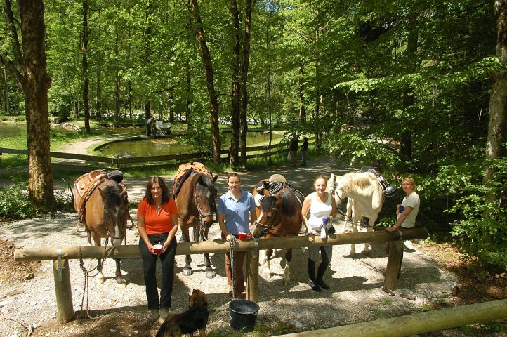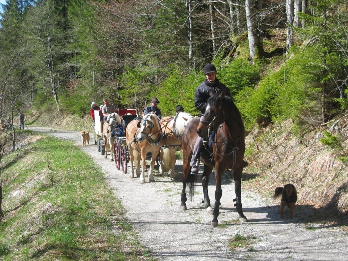 Wir sind zu Fuß mit den Pferden unterwegs in die herrliche Umgebung des Tegernseer Tals, unser Tagesgepäck tragen die Pferde.